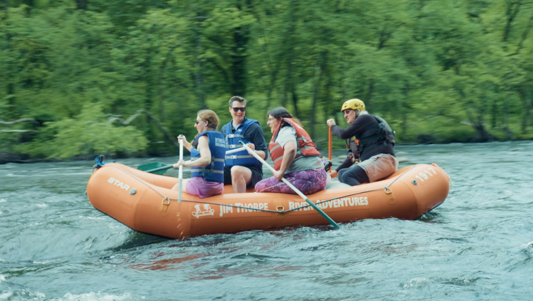 Magnolia and the Bouscher and Connor families work together to navigate a river’s twists and turns while white-water rafting in the Poconos.